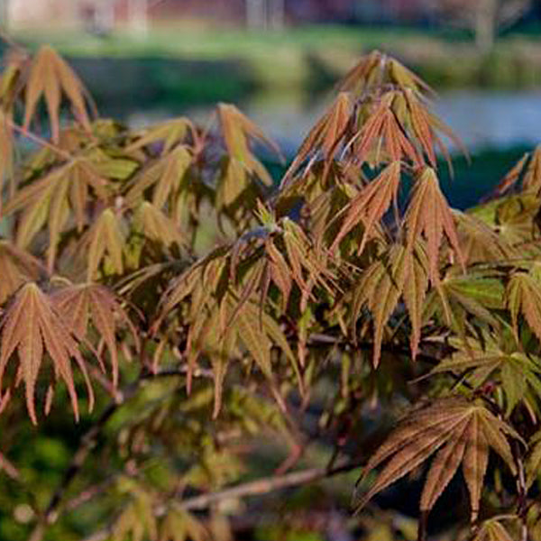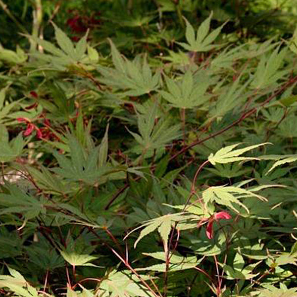 A member of the Matsumurae group. This cultivar's deeply divided, seven lobed, serrated leaves are purplish-red with an undertone of green. New foliage is yellow-orange with fine pubescent covering until maturity. Leaf stalks and seeds are bright red. This tree reaches 20ft. tall and 16ft. wide in the right growing conditions. The name means "purple of the East".