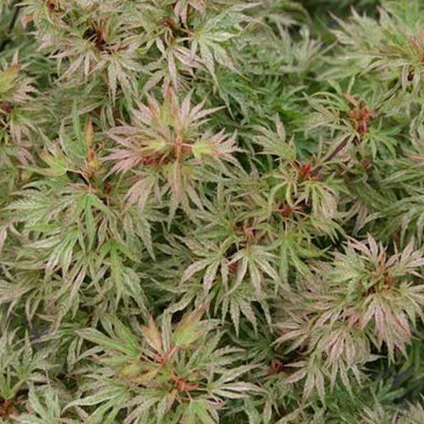 This charming little tree is full of constantly changing color. Small leaves with sharply pointed lobes are variegated along the vein of the leaf. Emerging pastel to hot pink and white in spring out of bright red leaf sheath, changing to green and white in summer and yellow gold in the fall. The internodes are stacked on top of one another creating a dense pillow of color. Very slow though not delicate the variegation will require protection from hot afternoon sun.